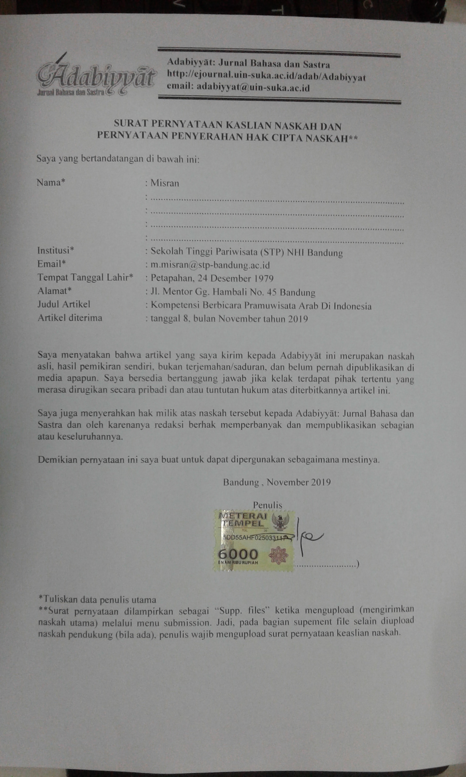 1. Jurnal Adabiyyāt: Jurnal Bahasa dan Sastra memublikasikan seluruh artikel yang dimuatnya secara keseluruhan (full text).
