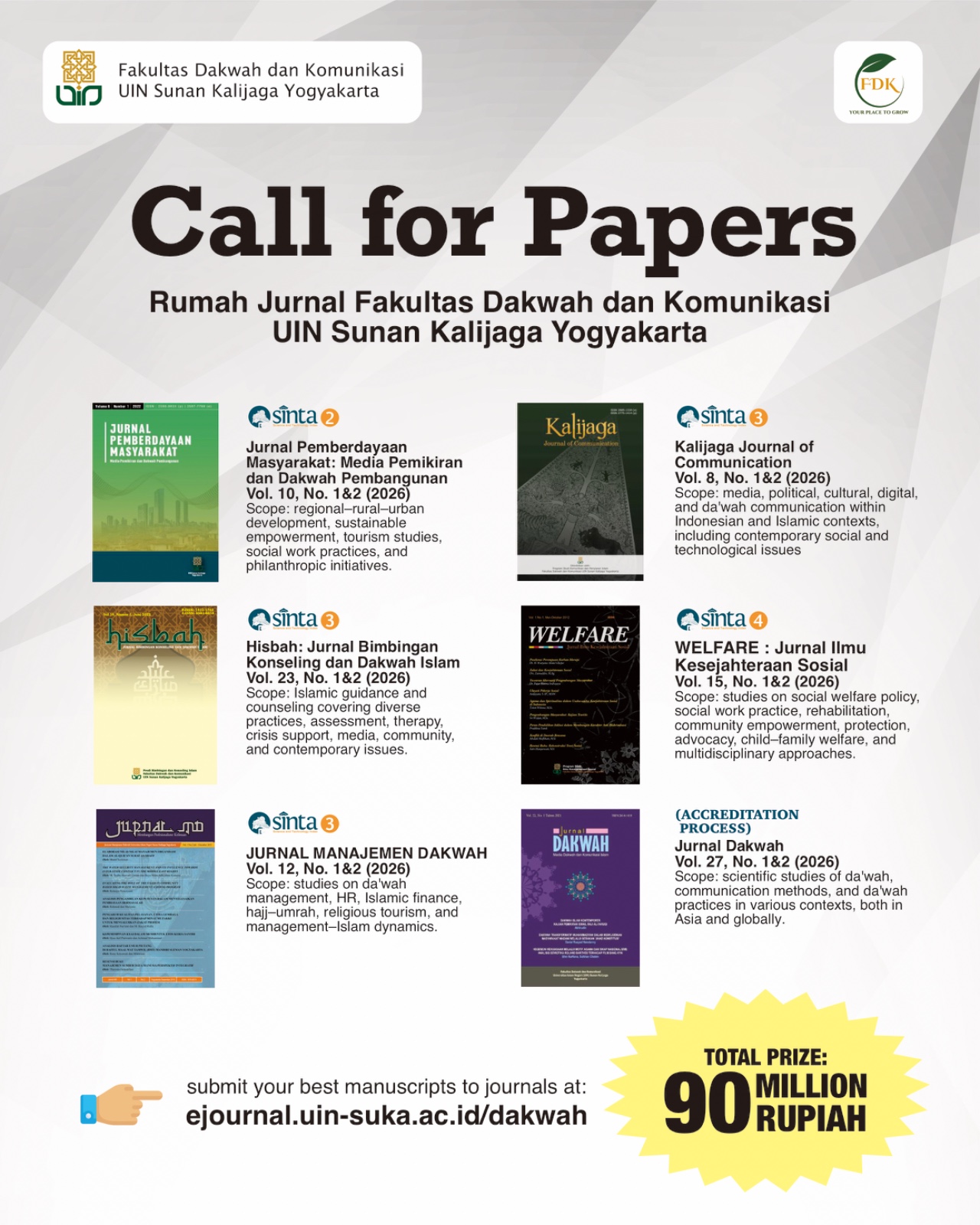 Read more about Call for Paper 2026Jurnal Dakwah: Media Komunikasi dan Dakwah, published by the Faculty of Da'wah and Communication at Universitas Islam Negeri (UIN) Sunan Kalijaga Yogyakarta, is available in both print (ISSN 1411-5905) and online (ISSN 2614-1418) formats. This international journal focuses on the publication of scholarly work in the fields of da'wah and communication. Its primary focus is on scientific studies of da'wah, communication methods, and da'wah practices in various contexts, both in Asia and globally. Read More >
