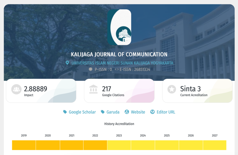 Kalijaga Journal of Communication invites scholars, researchers, and practitioners to submit their manuscripts for publication in Vol. 8 No. 1, scheduled for release in June 2026. For this issue, we welcome a wide range of scholarly contributions examining media and communication. Priority will be given to manuscripts addressing key contemporary issues such as environment, technology, and empowerment. Submissions involving collaboration with international authors are highly encouraged and will receive special consideration.
