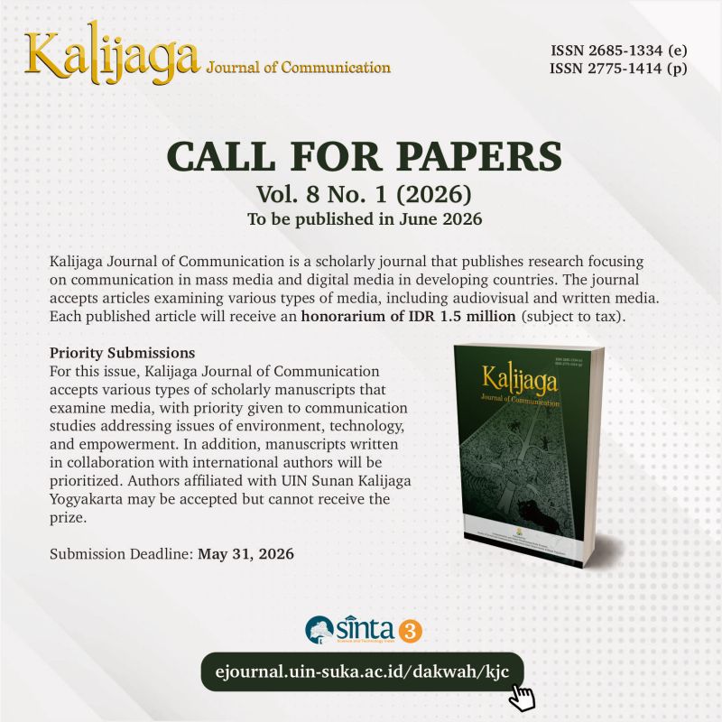 Kalijaga Journal of Communication invites scholars, researchers, and practitioners to submit their manuscripts for publication in Vol. 8 No. 1, scheduled for release in June 2026. For this issue, we welcome a wide range of scholarly contributions examining media and communication. Priority will be given to manuscripts addressing key contemporary issues such as environment, technology, and empowerment. Submissions involving collaboration with international authors are highly encouraged and will receive special consideration.