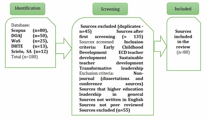 In this review, we considered articles published from 2007 - 2024, the period after UNESCO's 2008 report ‘The Contributions of Early Childhood Education to Sustainable Development’. Only peer-reviewed papers were considered for inclusion in this review since it emphasizes research quality (Ardoin & Bowers, 2020). The year 2007 was pivotal in South Africa's educational landscape due to significant policy reforms and shifts in leadership perspectives. This period marked a focus on improving the quality of education in disadvantaged schools, reflected in measures like the Education Laws Amendment Act of 2007, which targeted infrastructure improvement and underperforming school regulation (Christie, 2010). In educational leadership literature, 2007 saw a shift toward distributed and instructional leadership models, emphasizing collaboration, emotional intelligence, and the dynamics of power in leadership (Bush & Glover, 2016). These developments collectively aimed to address systemic inequalities and foster inclusive, high-quality education across the country. Lastly, we included articles from teacher education with specific reference to ECD. Thus, the exclusion criteria were in essence antonyms of the inclusion ones. Based on this, we selected sources from DHTE, Scopus, WoS, DOAJ, and Scielo SA databases, since these are documented for their thoroughness in research, mostly in the field of teacher education.