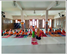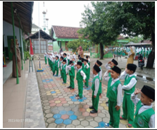Mixed-group dramatizations of historical events ("Proklamasi 1945", "Hari Kartini") encouraged cooperation across gender and faith lines. In RA Muslimat NU 007, the teacher assigned "unity badges" that children could award peers who demonstrated helpfulness; 83 % of badges during the observation period were given across religious lines, indicating internalization of the inclusive norm rather than in-group preference. Figure 3. Children carrying out the Independence Day Proclamation ceremony.