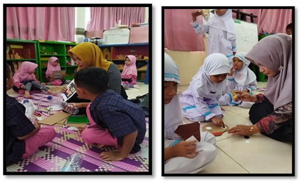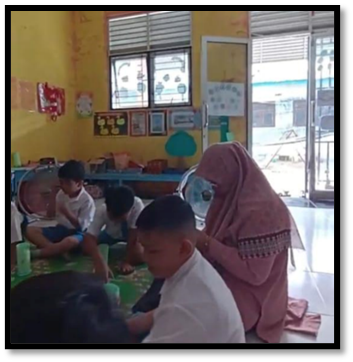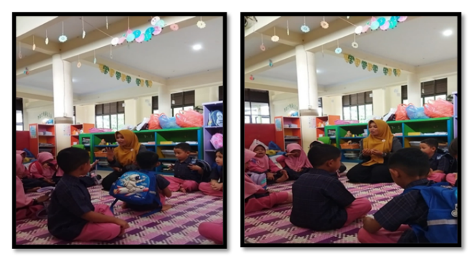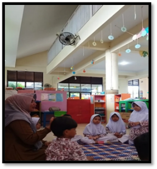 Figure 3 shows children seated in a circle, a setup that promotes inclusivity and collaboration (Bergotong Royong). The teacher’s body language, leaning forward, maintaining eye contact, suggests an emphasis on responsive interaction, essential for young learners’ confidence. The mention of class rules "making a commitment" further ties to the Berakhlak Mulia (noble character) dimension, as children internalize responsibility and collective norms.