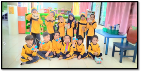 The project-based activities at TK IT IM and TK N B demonstrated differentiated approaches designed to align with each school’s unique learning objectives while still centering on creativity, problem-solving, and collaboration. At TK IT IM, the emphasis was placed on fostering children’s independence and innovation. The learning process began with students watching short videos that introduced creative ideas for crafting toys out of recycled materials. Examples included simple yet engaging objects such as propellers, spinning tops, and miniature cars. After viewing these demonstrations, the teacher provided visual prompts by displaying pictures of different toy designs. This method gave children the freedom to make their own choices about which toy to create, thereby nurturing a sense of autonomy. Once the selection was made, students enthusiastically started constructing their chosen designs, working with materials such as cardboard, plastic bottles, and bottle caps. The activity allowed them to explore engineering concepts informally while strengthening fine motor skills through cutting, folding, and assembling.