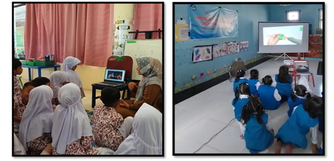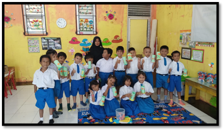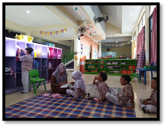 This opening activity can be done by each class teacher in their respective classes, or at the school level, namely in the school hall. In this activity, the teacher starts the activity with several activities such as greeting the children by clapping enthusiastically, singing the song "Every day I wake up in the morning", and informing the children of the theme for that week. In this opening activity, the teacher also gives the children some opening questions, such as: