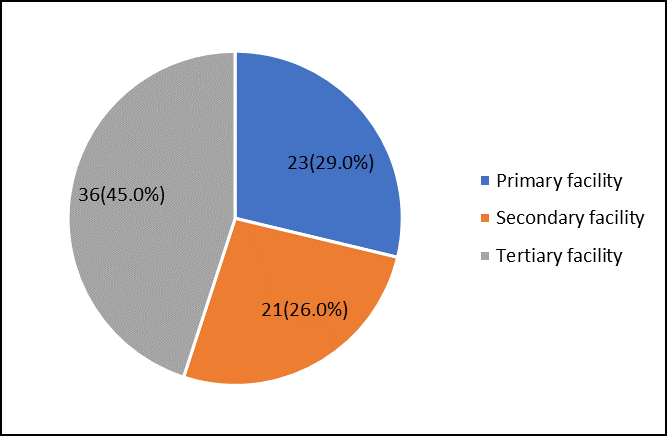 Thirty six (45.0%) of the respondents work in tertiary institutions while the least 21(26.0%) work in secondary Health institutions Figure 1.