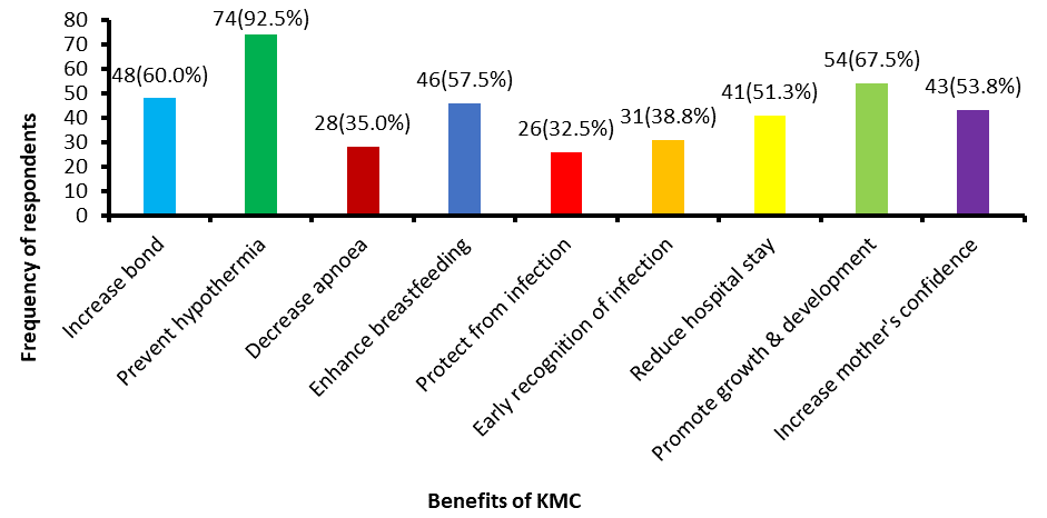 Majority 79(98.8%) of the HCPs do not know the definition of KMC, Most 32(40.0%) of the respondents knew only one out of the four elements of KMC, while 24(30.0) do not know that mothers can sleep while doing KMC. Only a few 13(16.3%) of the respondents incorrectly mentioned that only the mother can do KMC in table 3. This lack of knowledge among HCPs highlights significant gaps in training and awareness regarding KMC practices. Such gaps can impede the effective implementation of KMC and reduce its potential benefits for both mothers and infants. Addressing these knowledge deficiencies through comprehensive training programs is crucial. These programs should cover all elements of KMC, including its definition, the ability for mothers to sleep during KMC, and the involvement of other caregivers besides the mother. By improving HCPs' understanding and competency in KMC, healthcare systems can enhance the support provided to low birth weight infants and their families, ensuring that the practice is correctly and effectively utilized. More than half of the respondents were not knowledgeable on the benefits of KMC such as early recognition of infection and protection from infection inFigure 2.
