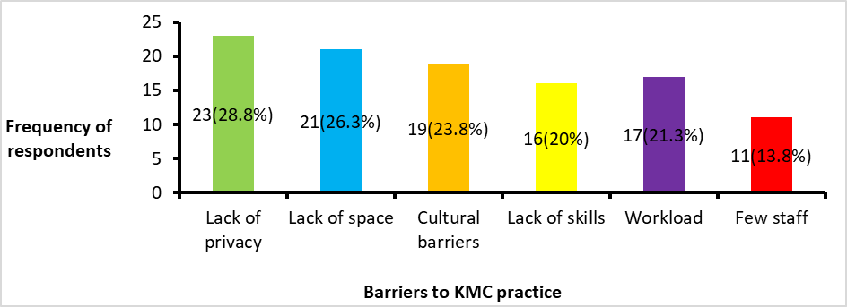 Findings – The mean age of the HCPs was 32.9±7.6 years, with the majority, 30 (37.5%), having less than five years of working experience. Of the 80 respondents, 41 (51.3%) were nurses, 9 (11.2%) were doctors, and 16 (20.0%) were midwives. Forty-three (53.7%) of the HCPs practiced KMC. The most common barriers to implementing KMC among the HCPs were lack of privacy for the mothers (23, 28.8%), lack of space for the mothers (21, 26.3%), cultural reasons (19, 23.8%), and lack of skills on KMC (16, 20.0%). The factors associated with the practice of KMC were previous training on KMC and working in tertiary hospitals (p<0.05).