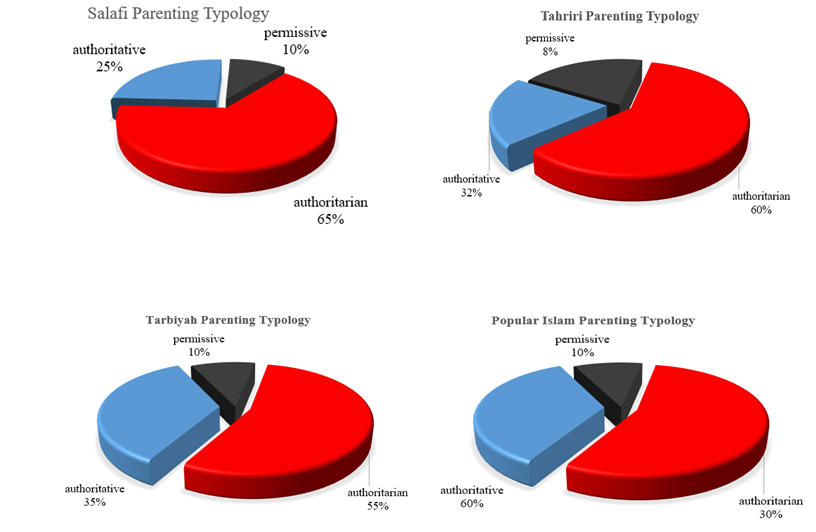 Based on the results of a survey conducted by the author on millennial Islamism families, the author provides a questionnaire to parents based on their parents’ affiliation with Islamism ideological groups such as the Salafi, Tarbiyah, Tahriri, and Popular Islamism groups. The findings of this study show that each Islamism group has different principles for expressing Islamism ideology in parenting practices. The results of a survey through a questionnaire conducted by the author to Islamism millennial parents related to parenting typology are as follows: